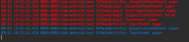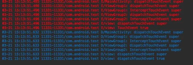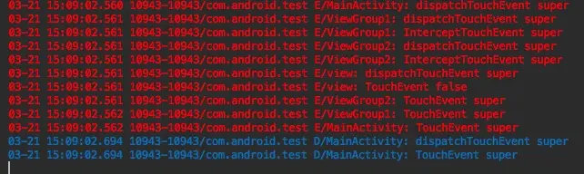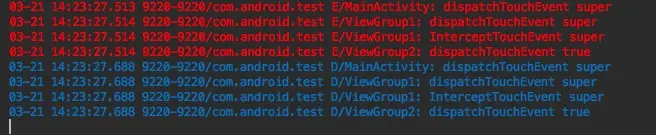 - 然后我们让dispatchTouchEvent()方法返回true(这里在viewGroup2里返回),log如下:
