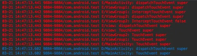 - 然后我们让dispatchTouchEvent()方法返回false(这里在viewGroup2里返回),log如下: