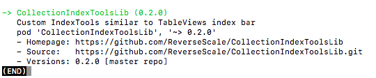 例子: 我有封装过一个工具CollectionIndexTools,CollectionIndexTools 可以给 Collection 添加一个类似 TableView 右侧的索引条,我想通过 Podfile 中添加 pod 'CollectionIndexToolsLib' 即可使用.