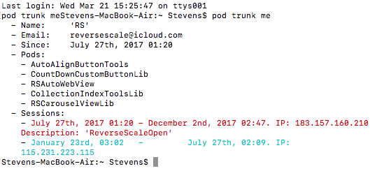 查看自己的注册信息,以后当你有了自己的开源Pod库,也可以用此方式随时查看自己发布过的Pods: