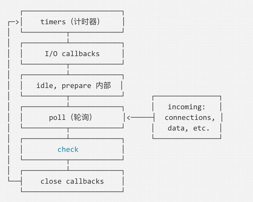 当Node.js启动时,它会初始化事件循环,这可能会调用异步API调用,定时器或调用 process.nextTick(),然后开始处理事件循环。