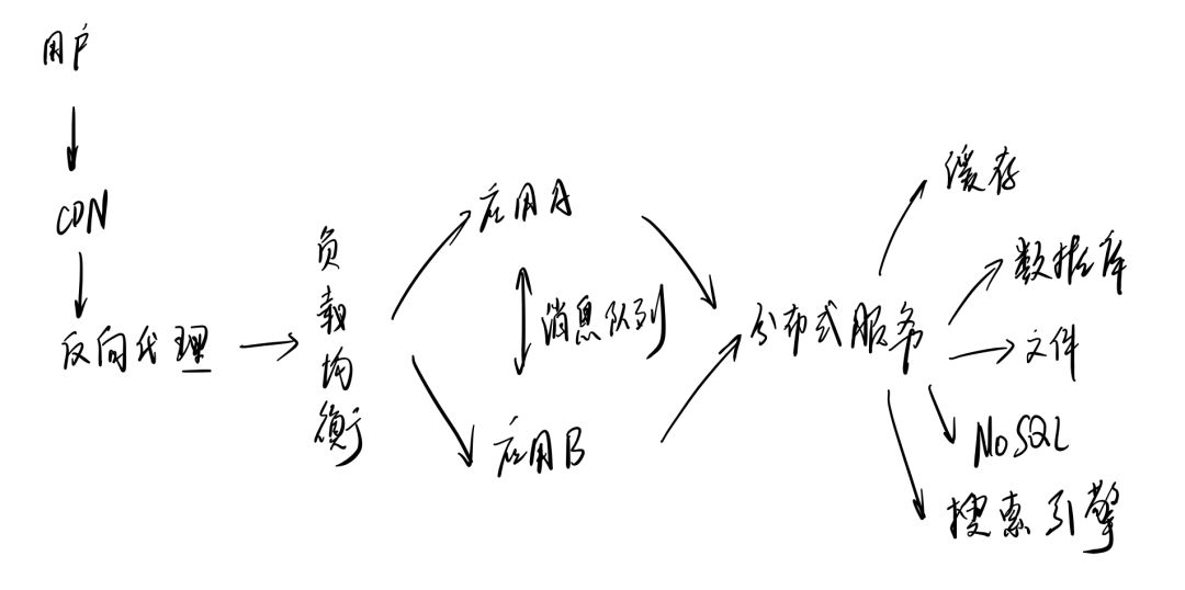 最后我们小结一下,在最终网站架构下,用户请求的处理流程。首先,用户请求通过CDN,到网站的反向代理,然后经由负载均衡分发到应用集群的某一台机器上进行处理,而应用则根据业务拆分,相互之间通过消息队列传递数据,并且调用分布式服务进行业务逻辑处理,分布式服务从分布式缓存中读取数据,往分布式数据库中写入数据,针对特定场景还会使用到NoSQL和搜索引擎,再拿到数据后,分布式服务将处理后的数据原路响应给用户。