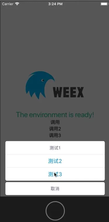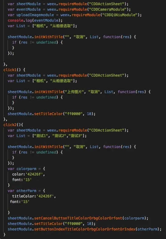 weex 封装actionSheetModule lqkin 2018-03-22 235 阅读1分钟 效果图如下 1.weex 调用实例如下 源码在工程,src -> index.vue文件 源码链接地址: https://github.com/liqian460385335/WeexActionsheet.git
