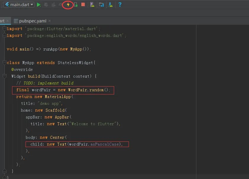 下面我们在代码中使用这个包里面的WordPair类,生成随机的单词,代替Hello World,代码如下。红线是新加的代码,然后点一下工具栏的Flutter Hot Reload按钮,就可以直接热重载界面。生成随机单词代替了Hello World。