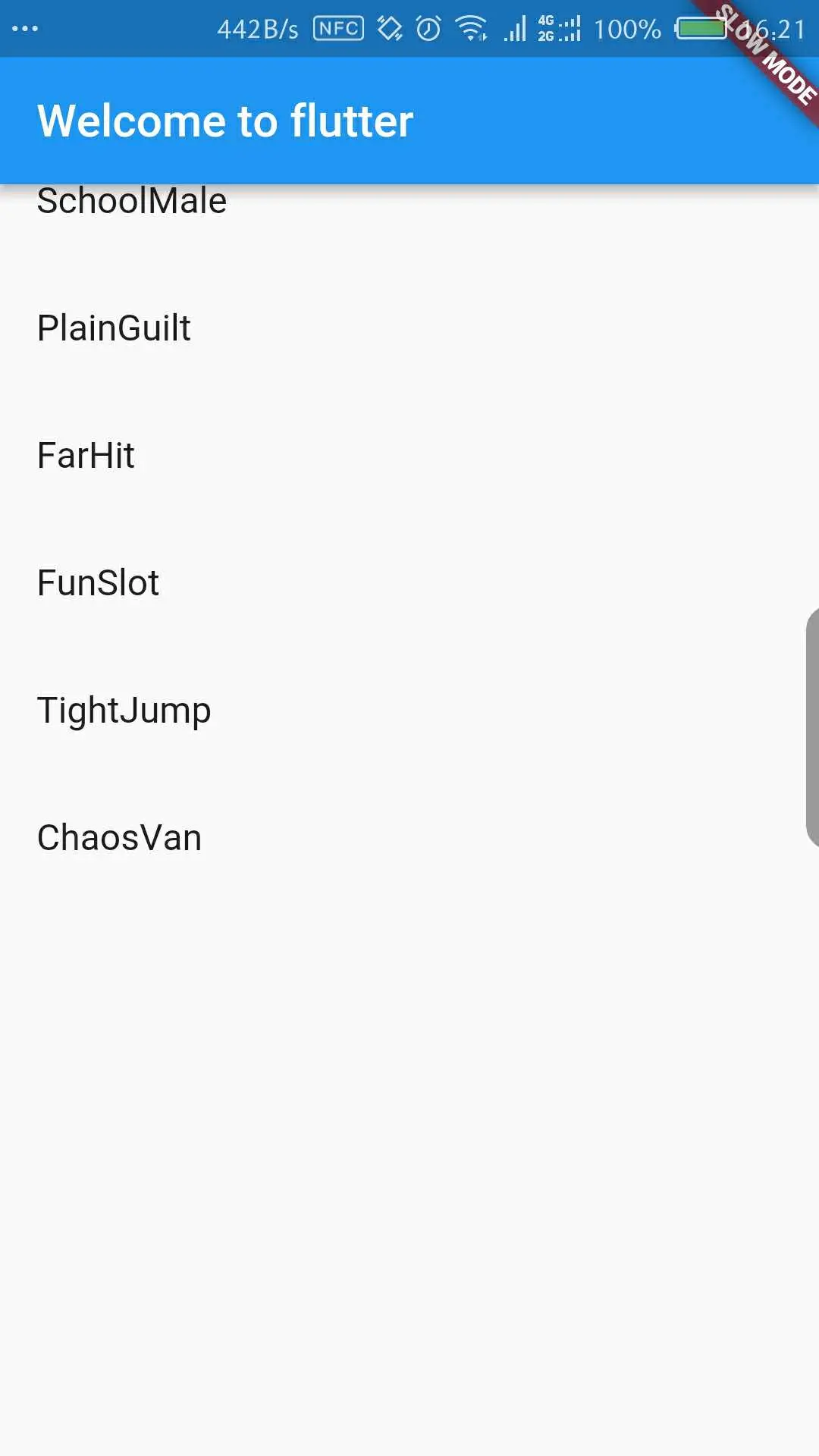 这时候运行一下,发现列表出来了。但是上拉滑动的时候发现问题了,超出20个item之后还可以向下滚动,白屏,如图。
