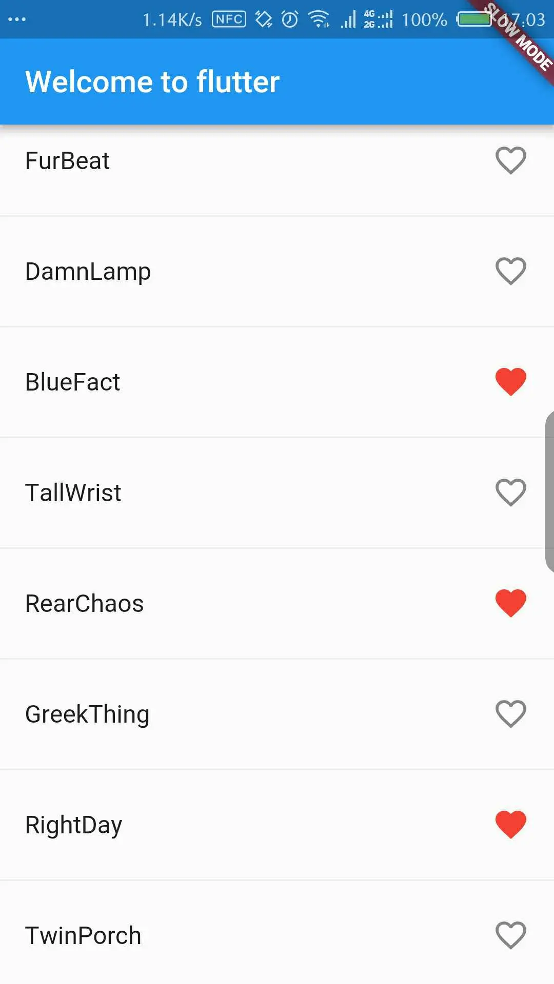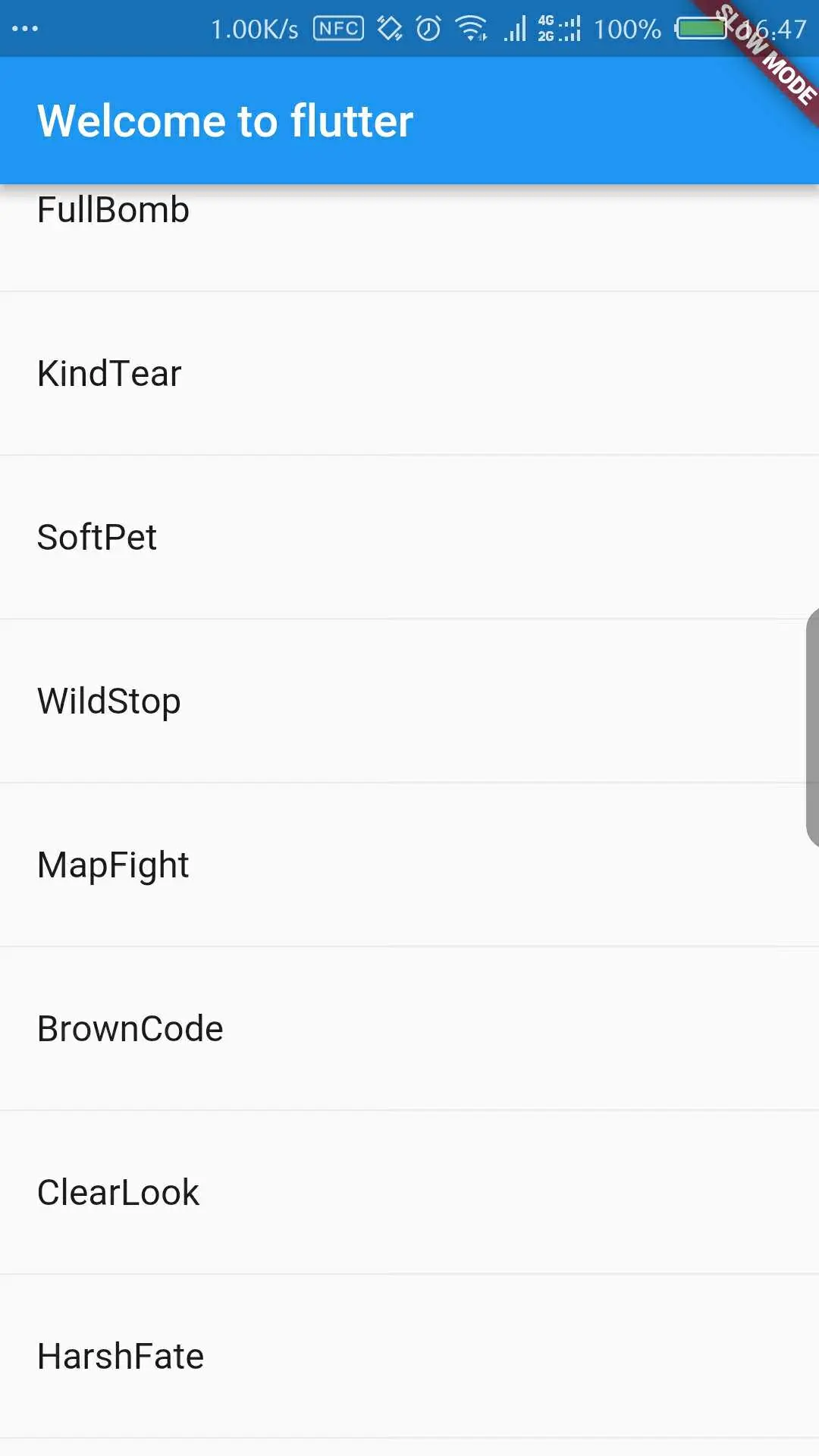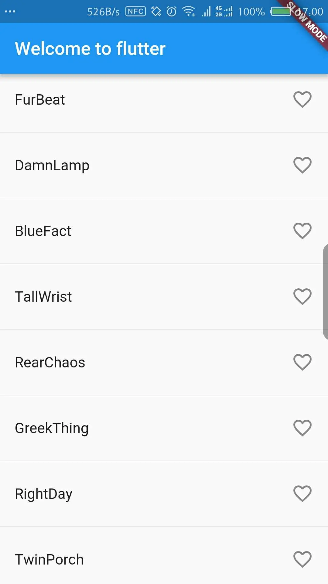 下面将这个widget添加到我们的页面上去,在RandomWordsState的build里面描述要展示的内容。然后把这个widget展示到body里面去,展示的效果不变,代码如下:
