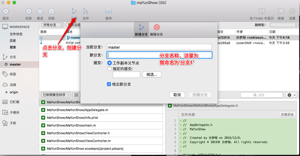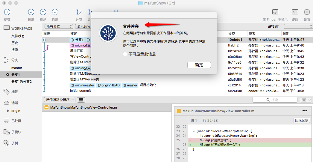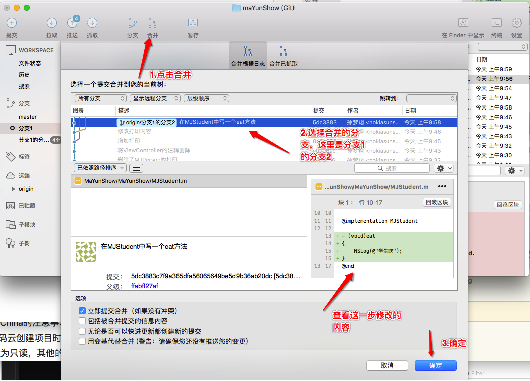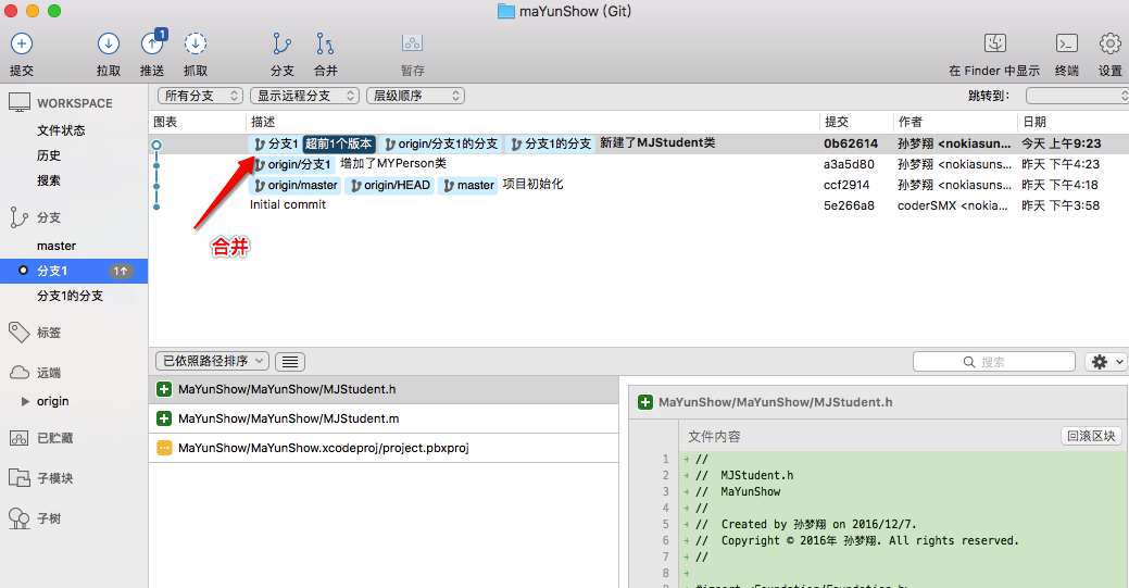 有两个分支:分支一 、分支一的分支,合并这两个分支,首先双击分支一,点击菜单栏”合并“