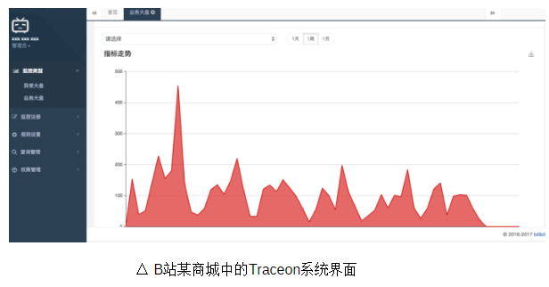 上图是B站某商城中的Traceon系统界面。它可以发现某些地方出现的峰值、问题。通过报警规则,把信息发给报警系统,通知具体人员来处理它。