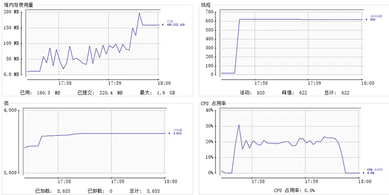 在使用固定600个线程的线程池的情况下,mac-rpc在CPU使用(25%)上略高于dubbo(20%),在内存使用上则显著优于dubbo(50~200M),稳定在50M左右。