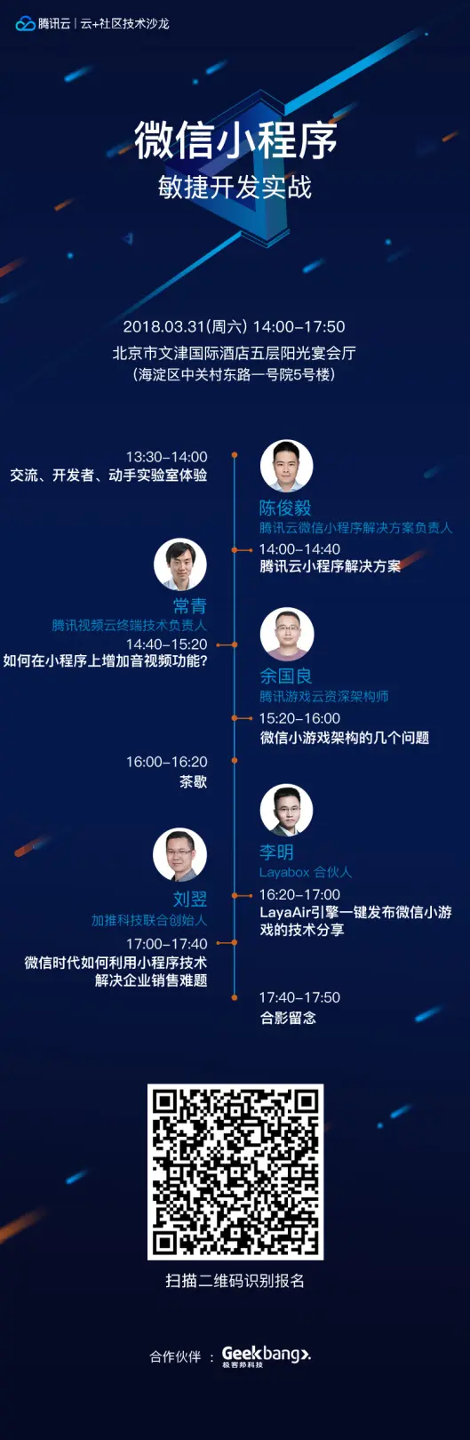 那么,作为一名开发者,该如何快速开发设计出一款火爆的小程序?本期云+社区技术沙龙,将围绕“微信小程序敏捷开发实战”展开深入地探讨,从小程序的云端解决方案到小游戏前端与服务器框架再到小程序架构设计,一站式分享解析如何从0到1低成本甚至零成本打造爆款小程序,让微信小程序开发真正实现“触手可及”。