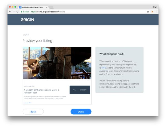 IPFS是来自Protocol Labs的一个项目,它提供分散式文件存储功能,可以将更大的内容有效存储在对等网络的服务器上。 这些字母代表"Interplanetary File System"。Origin Demo DApp使用IPFS来存储列表详细信息,如照片和文字描述。