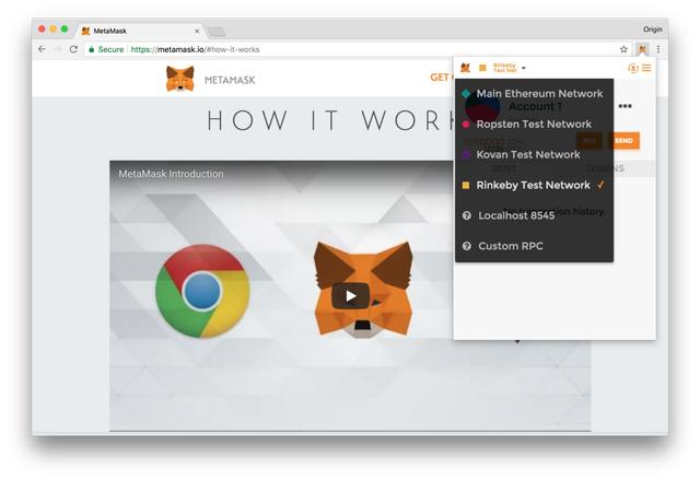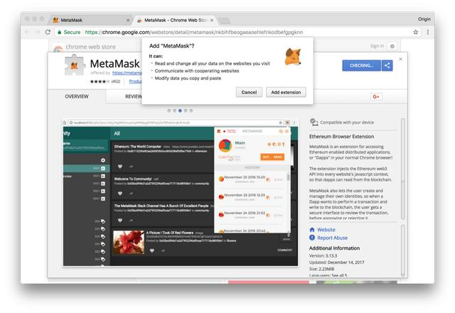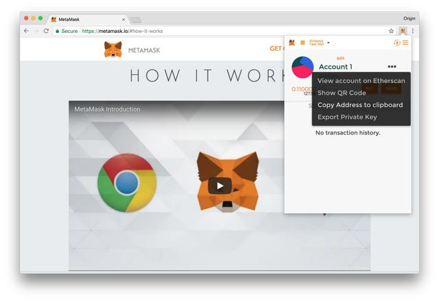 MetaMask是一个免费的Chrome扩展,它是一个以太坊钱包,也是网络和以太坊之间的桥梁。 例如,当您在我们的Demo DApp中购买产品时,网页上的代码会启动MetaMask,其中包含向哪里发送以太网的详细信息。