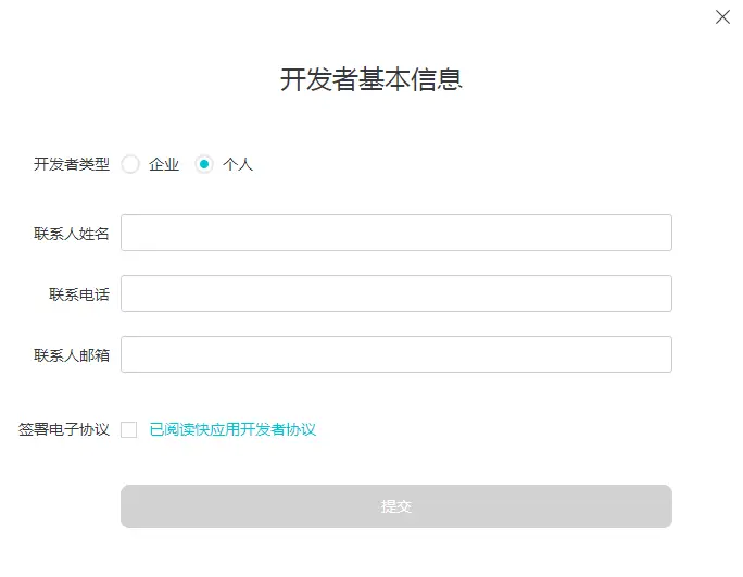 5、所有填写的信息要求真实有效,并且需要同意快应用开发者协议