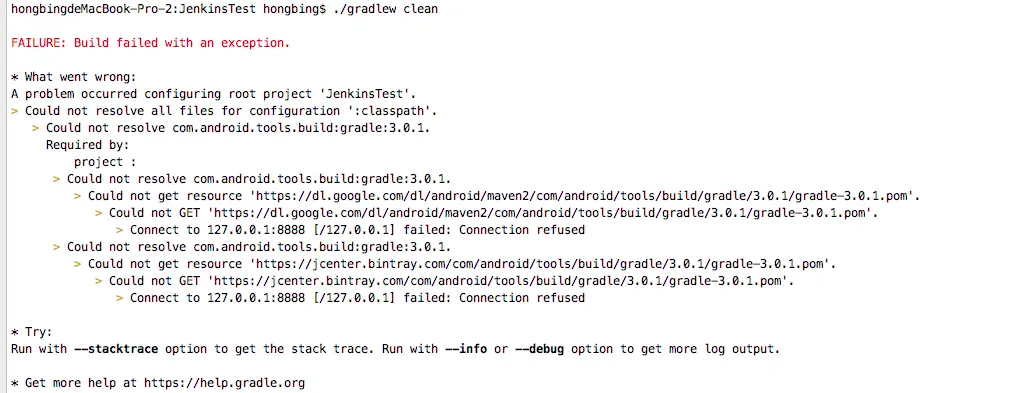 但,按照要求都配置好后,重新构建还是会出现这个错(前提:我在项目中直接run或者Generate Signed APK...都是可以的,没有任何问题);怀疑jenkins插件问题?也在jenkins的官方jira上提了issue。怀疑jenkins中Gradle版本问题?也配称了本地的4.1。可以说和本地没啥区别了;但测试后还是不行,错误依然如期而至。顿时,心中一万个草泥马在快速奔跑;你他妈逗我吗?收拾收拾心情,重新去思考;会不会还有什么其他地方没注意到,于是继续盯着错误信息看,看到Could not get resource ‘http://…………’,什么鬼?拷贝下来,到自己的浏览器中去试下;也是提示404,为啥,插件中的资源没法访问下载?难道是我的网络问题,但是都尼玛好的,也翻墙了,Google搜索引擎都玩的很愉快,继续看错误日志;Connect to 127.0.0.1:8888 failed,这不是我开代理设置的地址吗?难不成是它搞得鬼,于是乎,关掉代理,继续尝试,还是他妈的不行啊?谁能告诉我,why?开启终极大招,重启jenkins,重启电脑,再来一边,终于可以愉快的和这个问题说88了;最后归根到底是代理惹的祸,跟什么gradle4.1和com.android.tools.build:gradle:3.0.1没有任何关系,只要正确的配置google()就行;