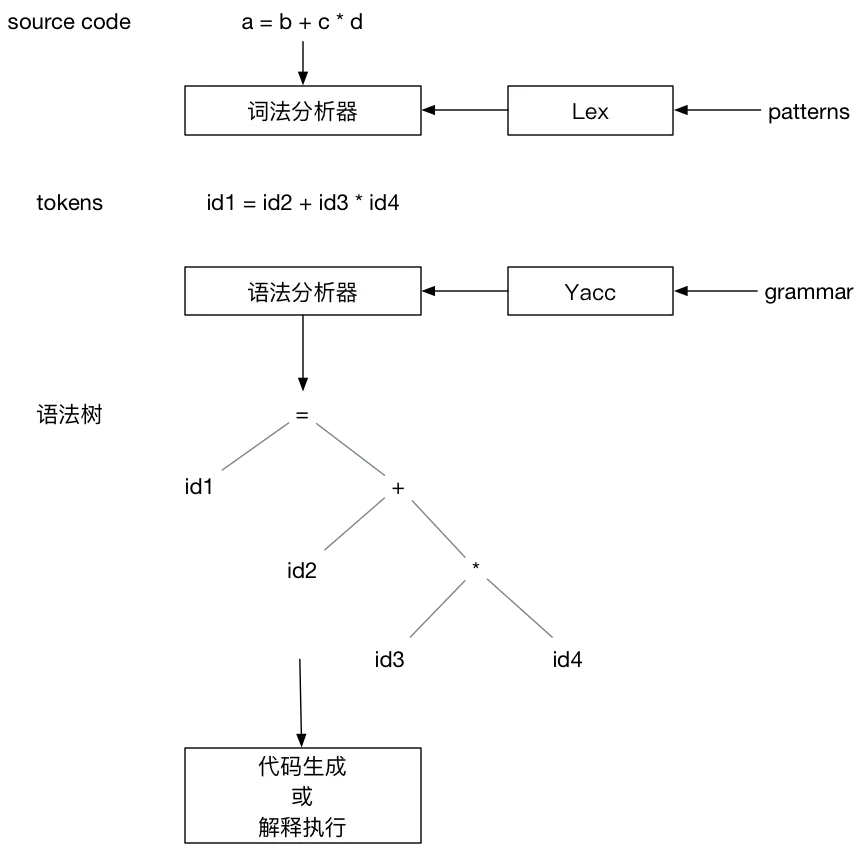 上图描述了使用 Lex & Yacc 构建编译器的流程。Lex 根据用户定义的 patterns 生成词法分析器。词法分析器读取源代码,根据 patterns 将源代码转换成 tokens 输出。Yacc 根据用户定义的语法规则生成语法分析器。语法分析器以词法分析器输出的 tokens 作为输入,根据语法规则创建出语法树。最后对语法树遍历生成输出结果,结果可以是产生机器代码,或者是边遍历 AST 边解释执行。