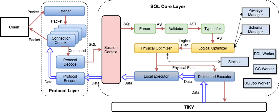 PingCAP 发布了 TiDB 的源码阅读系列文章,让我们可以比较系统的去学习了解TiDB的内部实现。最近的一篇《SQL 的一生》,从整体上讲解了一条 SQL 语句的处理流程,从网络上接收数据,MySQL 协议解析和转换,SQL 语法解析,查询计划的制定和优化,查询计划执行,到最后返回结果。