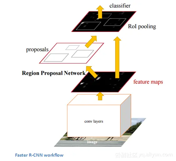 Faster R-CNN致力于将R-CNN和Fast R-CNN比较复杂的训练步骤简单化。作者在最后一个卷积层后插入候选区域生成网络,该网络能够查看最后的卷积特征映射并产生候选区域。后面使用与R-CNN相同的方法:感兴趣区域池化、全连接层、分类和回归头。