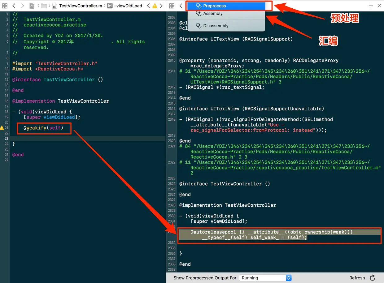 随便写一个宏,然后打开Xcode右上方的Assistant,选择“Preprocess”就可以看到该文件预处理之后的样子了。可以看到左边的@weakify(self) 被转换成了右边的两行代码了。