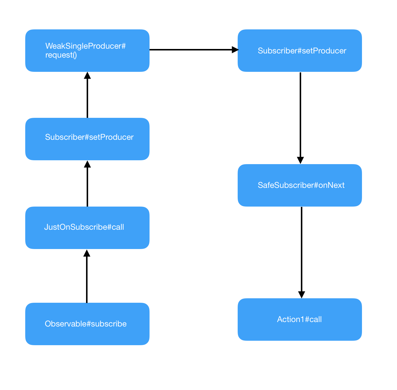 just()中,生成了一个新的Observable对象,并且Observable.onSubscribe为JustOnSubscribe justOnSubscribe.call(subscriber)的subscriber,是RxJava根据我们在subscribe()传递的Action1生成的ActionSubscriber。justOnSubscribe.call()中,生成了一个WeakSingleProducer,并且为ActionSubscriber设置了WeakSingleProducer。