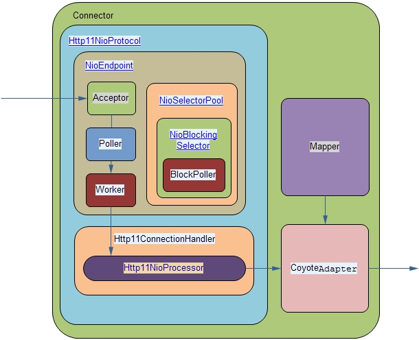 java.util.concurrent.ThreadPoolExecutor的扩展,NioChannel 是对 ByteChannel 的扩展,KeyAttachment 则是对 NioChannel 的包装 - 很多类设计成非 GC 的,方便缓存和重复使用,实现方式都是通过 ConcurrentLinkedQueue 类构造一个队列。比如 NioEndpoint 类里面的 ConcurrentLinkedQueue processorCache、ConcurrentLinkedQueue keyCache、ConcurrentLinkedQueue eventCache、ConcurrentLinkedQueue nioChannels 。Poller 类里面的 ConcurrentLinkedQueue events