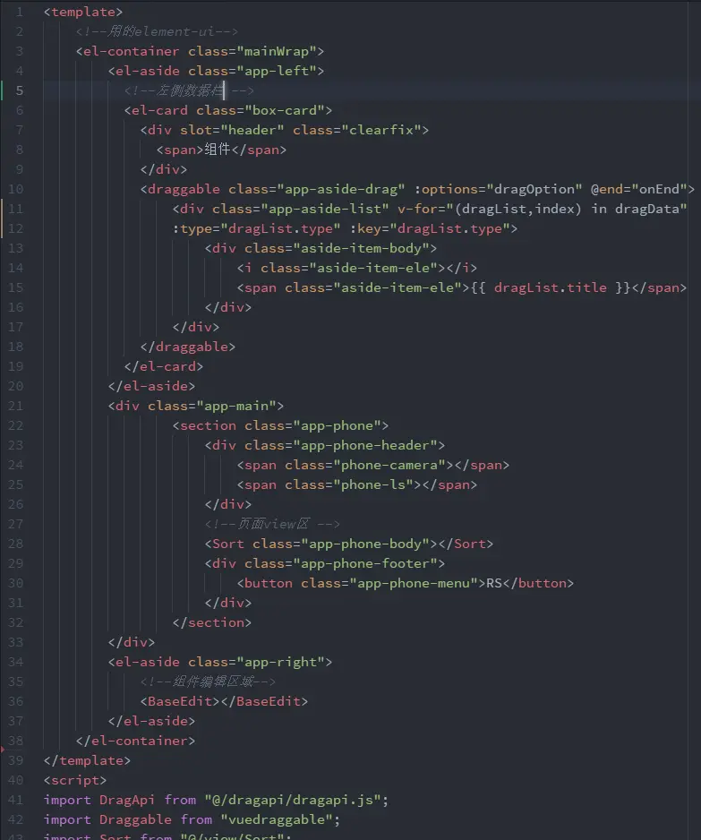 在App.vue主要有三个自定义组件,draggable的拖拽组件,Sort元素排序组件,BaseEdit元素样式编辑组件