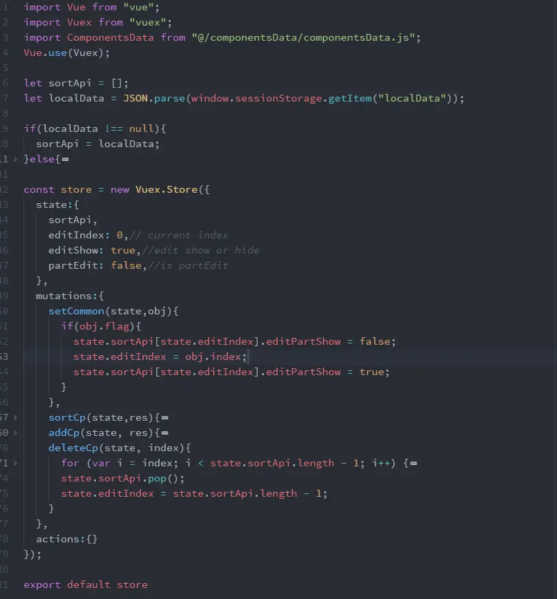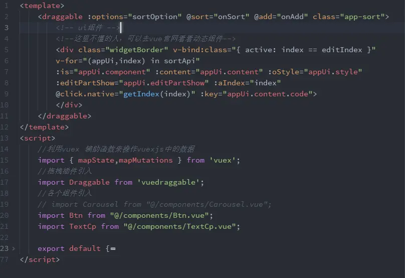 这个文件其实是挺好理解的就是显示组件视图,这里我们可以看到我们引入了Btn.vue、TextCp.vue这个两个组件,当拖拽组件到Sort的时候回显相应的组件视图。在Sort.vue也要引入vuex因为我们需要更新视图只要更新数据就可以了,这也是数据驱动的好处,不用再频繁的操作DOM。