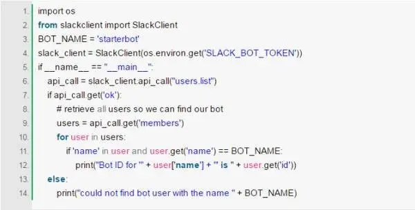我们的代码导入SlackClient,并用我们设置的环境变量SLACK_BOT_TOKEN实例化它。 当该脚本通过python命令执行时,我们通过会访问Slack API列出所有的 Slack 用户并且获得匹配一个名字为“satrterbot”的ID。
