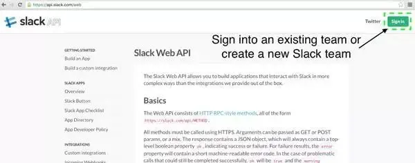 Slack 允许程序通过一个 Web API 来访问他们的消息传递通道。去这个 Slack Web API 页面 注册建立你自己的 Slack 项目。你也可以登录一个你拥有管理权限的已有账号。