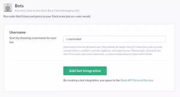 定制聊天机器人用户页面给你的聊天机器人起名为“starterbot”然后点击 “Add bot integration” 按钮。