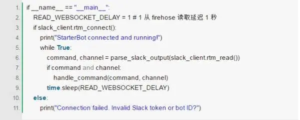 该代码通过我们以输出的环境变量SLACK_BOT_TOKEN 实例化SlackClient`客户端。