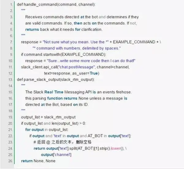 parse_slack_output 函数从 Slack 接受信息,并且如果它们是发给我们的 StarterBot 时会作出判断。消息以一个给我们的聊天机器人 ID 的直接命令开始,然后交由我们的代码处理。目前只是通过 Slack 管道发布一个消息回去告诉用户去多写一些 Python 代码!