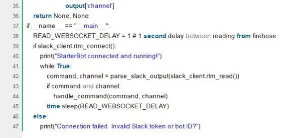 我们需要该ID,当解析从Slack RTM上发给StarterBot的消息时,它用于对我们的应用验明正身。我们的脚本也会测试我们SLACK_BOT_TOKEN环境变量是否设置正确。