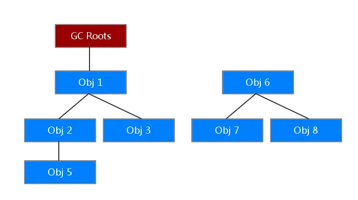 如图所示,就是通过一系列的称为"GC Roots"的对象作为起始点,从这些点向下搜索,搜索的路径称为引用链,当一个对象到达GC Roots没有任何引用链时,就可以证明这个对象是不可用的。那么这个对象就可以被回收了。像图中的Obj1-5都属于存活的对象,但是Obj6-8虽然还存在相互引用,但是已经是可以认为是死掉的对象了。