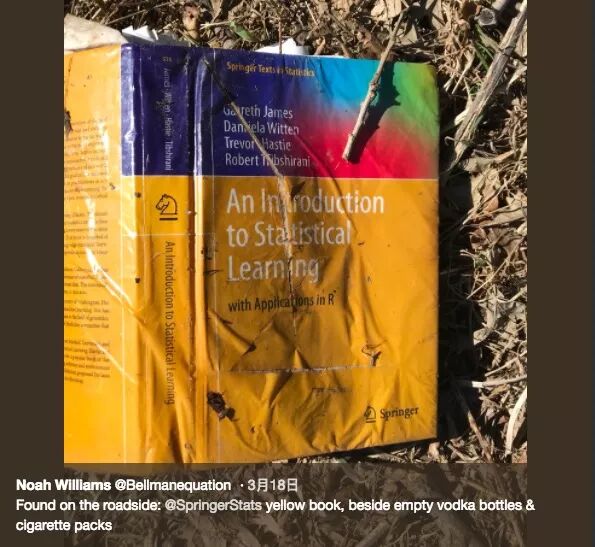 为了理解这些概念,首先我们还是得提一下这本黄黄的、“可爱”的、砖头一样的教材:《统计学习入门》(An Introduction to Statistical Learning with Applications in R)。几天前twitter上有许多人转发了一个段子,说有人在马路边捡到了一本破烂的《统计学习入门》,边上躺着一个空的伏特加酒瓶和空烟盒,这本书的“毒性”请自行体会。