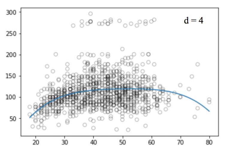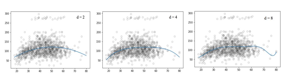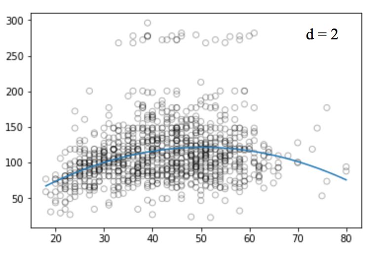 和线性回归那张图相比,上图中的曲线似乎更好地拟合了工资和年龄信号的分布,它们在形状上是非线性的。像这种使用非线性函数的做法,我们称它为多项式回归。