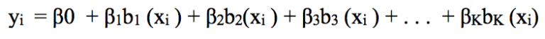 像这种可以组合在一起以捕捉数据分布情况的变换,我们称之为基函数,也称样条基。在根据年龄预测工资的这个问题中,样条基为b1(X), b2(X),…,bK(X)。