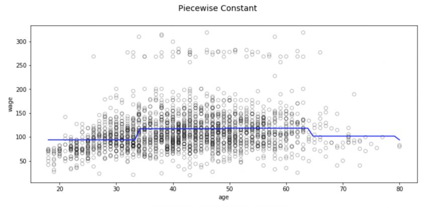 这种分区方法也存在一些问题,其中最显著的是我们期望输入不同,模型的输出也会发生相应变化。但分类回归不会创建预测变量的连续函数,因此在大多数情况下,其实它的假设是输入和输出之间没有关系。例如在上图中,第一个区间的函数显然没有发现到随年龄增长工资也会不断上涨的趋势。