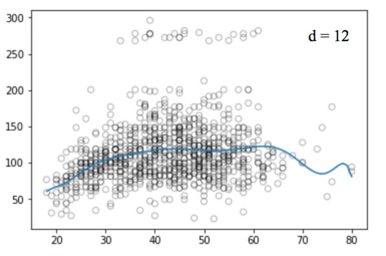 如果我们提高阶值,整个曲线会出现高频震荡,它的后果是模型过拟合。