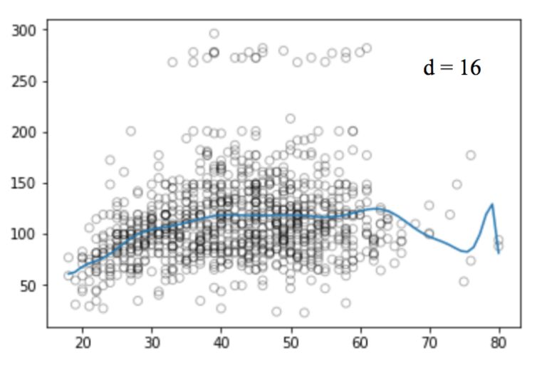 同样的,我们可以提高函数的幂(d),看看四次、十二次、十六次、二十五次回归函数的图像: