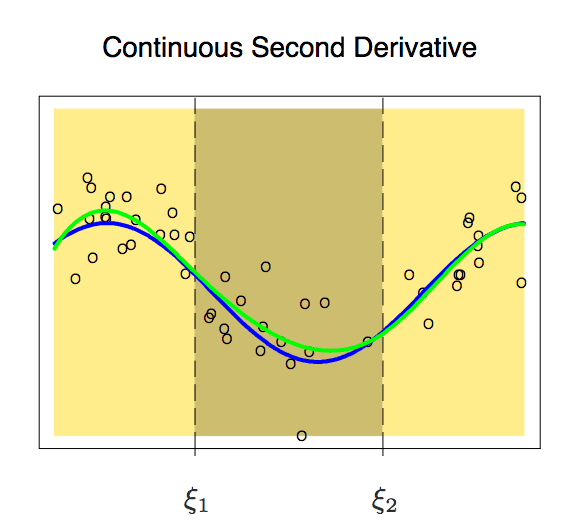 说了这么多,那么当我们拟合样条时,我们该怎么选择节点?一种可行的方法是选择数据分布中的剧烈变化区域作为节点,如经济现象中的突变时刻——金融危机;第二种方法则是在数据变化复杂的地方多设置节点,在看起来更稳定的地方少设置节点,虽然这样做能起作用,但一般我们为了简便还是会截取长度相同的区间。另外,平均分配相同样本点个数是第三种常用的方法。