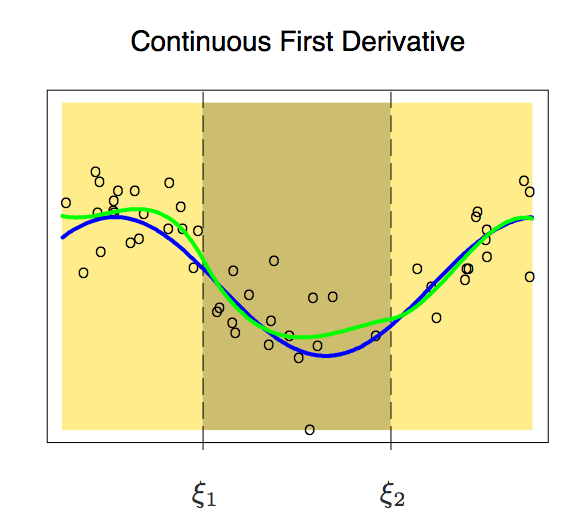 因为是分段的,两个区间的函数可能会出现不连续的现象。为了避免这种情况,一个必要的额外限制就是任一侧的多项式在节点上应该是连续的。