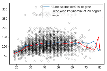 回归样条一般能比多项式回归得到更好的输出。因为它与多项式不同,多项式必须要用高次多项式灵活地拟合整个数据集,而回归样条在保留非线性函数的灵活性的同时,依靠节点保证了整体的稳定性。