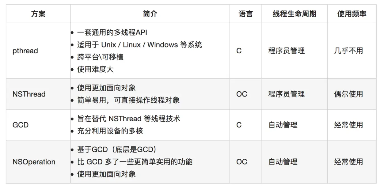 pthread: 跨平台,适用于多种操作系统,可移植性强,是一套纯C语言的通用API,且线程的生命周期需要程序员自己管理,使用难度较大,所以在实际开发中通常不使用。 NSThread: 基于OC语言的API,使得其简单易用,面向对象操作。线程的声明周期由程序员管理,在实际开发中偶尔使用。 GCD: 基于C语言的API,充分利用设备的多核,旨在替换NSThread等线程技术。线程的生命周期由系统自动管理,在实际开发中经常使用。 NSOperation: 基于OC语言API,底层是GCD,增加了一些更加简单易用的功能,使用更加面向对象。线程生命周期由系统自动管理,在实际开发中经常使用。
