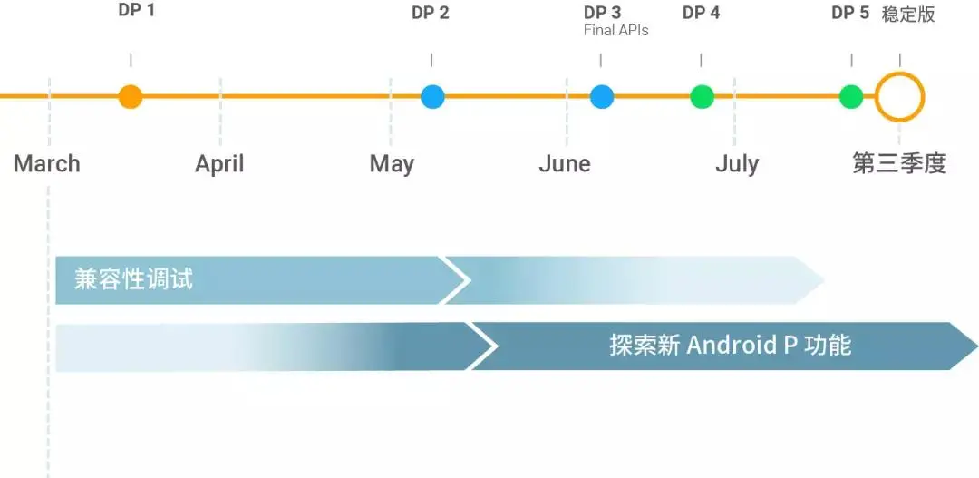 Android P 预览版为时数月。从首发到最终版将会有五次的更新,也就是从 DP1 到 DP5,然后在 2018 年第三季度发行最终稳定版。