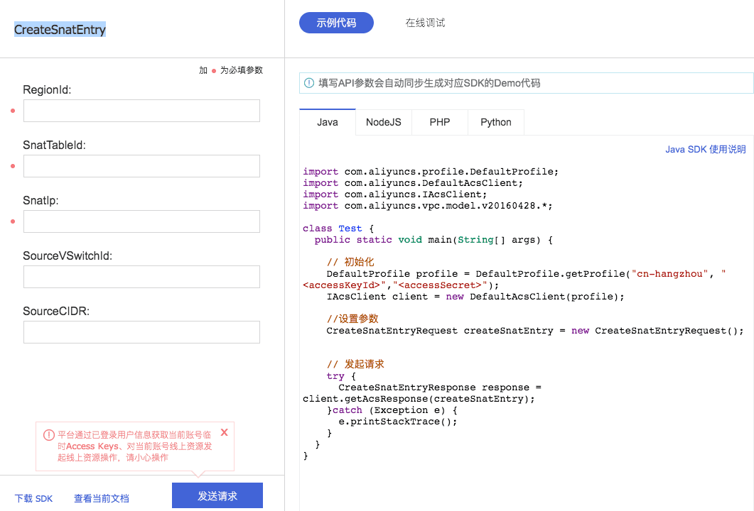 调用阿里云NAT网关API接口:CreateSnatEntry。下图给出了CreatSnatEntry的请求参数。