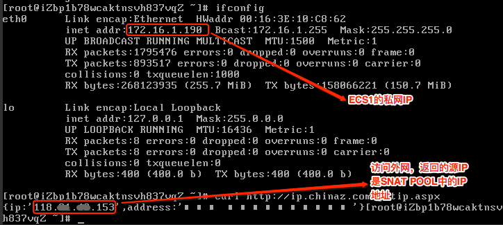 1.SNAT POOL创建成功后,指定的VPC ECS将随机使用SNAT POOL中的公网IP访问互联网。