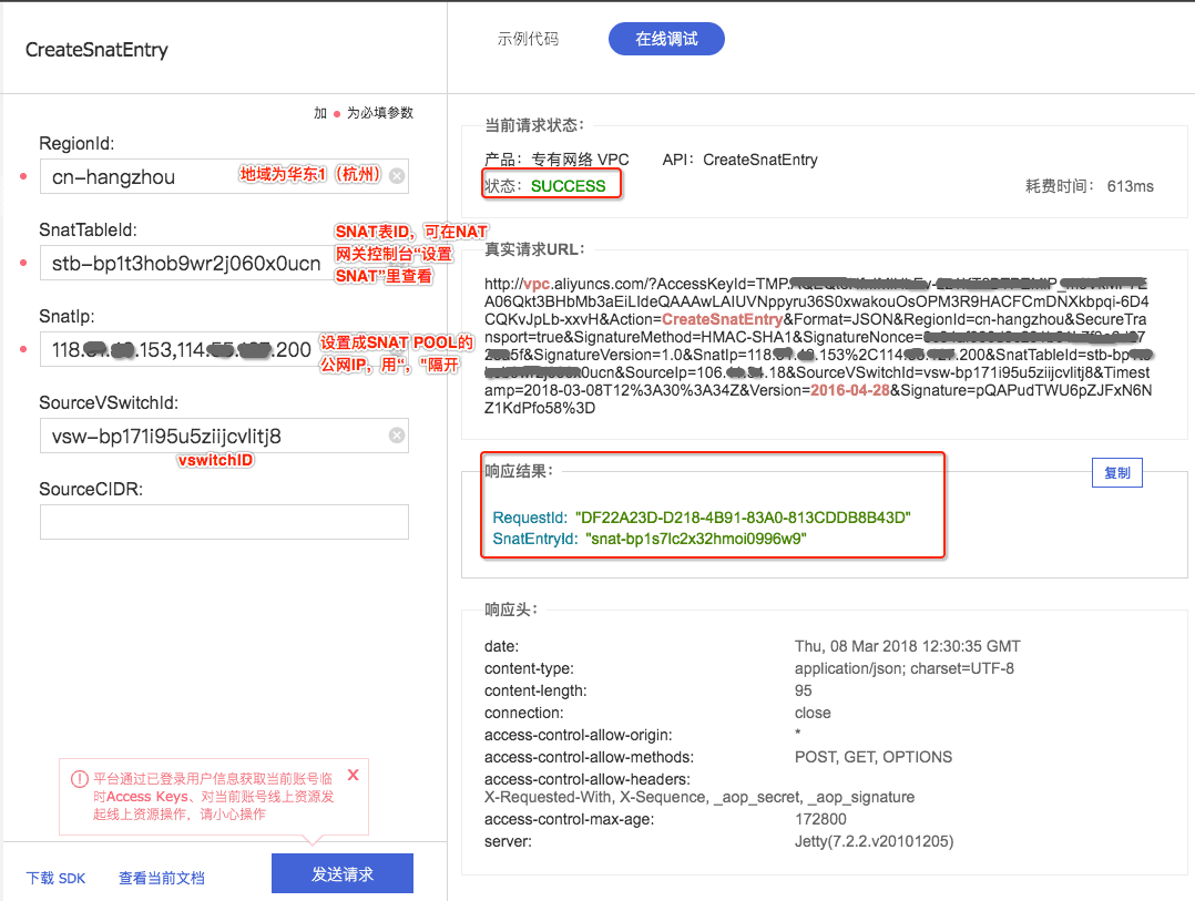 填入NAT网关的regionId,SnatTableId和需要设置SNAT的vswitchID。将要设置为SNAT地址池的2个EIP填入到SnatIp中,用逗号隔开,如下图所示。然后点击“发起请求”。