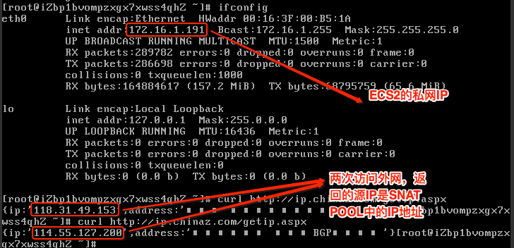 分别登录设置了SNAT规则的vswitch后的三台ECS,查看出网的源IP地址。