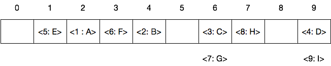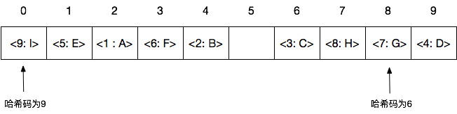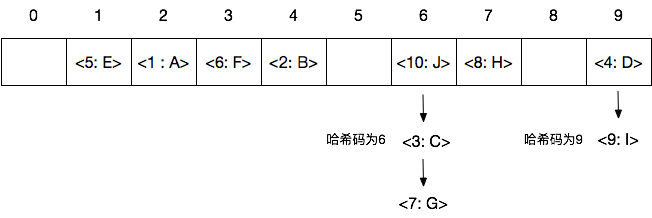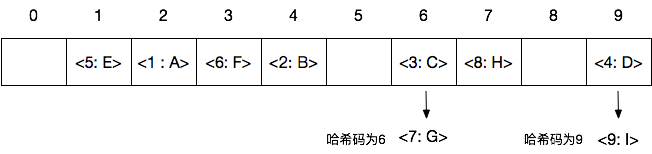 "1": A", "2": "B", "3": "C", "4": "D", "5": "E", "6": "F", "7": "G", "8": "H", "9": "I",假设通过键计算得到的哈希码分别是:2,4,6,9,1,3,6,7,9。可以看出,这些数据可以存储到一个长度为10的线性表中(存储的数据类型为结构体或者模型类):