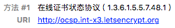 OCSP的全称是Online Certificate Status Protocol,即在线证书状态协议。顾名思义,它是一个用于检查证书状态的协议,浏览器使用这个协议来检查证书是否被撤销。使用Chrome浏览器查看www.fundebug.com的证书详情,可以看到OCSP的查询地址: